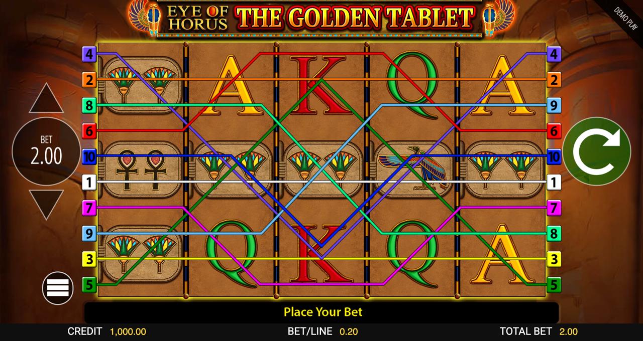 Horus is a wild that can grow and replace most other symbols. Eagle Eye of Horus: When Horus appears on The Golden Tablet Jackpot King Slot, the reels expand. This makes it more likely that multiple lines will connect on the same spin. In terms of design, the wild expansion also works with the new set of symbols during free spins. Eye of Horus: The Golden Tablet Jackpot King has expanding symbols that work well with wilds that are placed in the right places. Some players say that center-reel expansions feel the most powerful.
