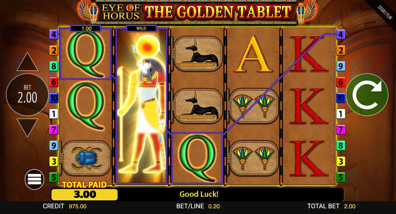 In real life, you'll notice that the cadence of features can change. The Golden Tablet Jackpot King Slot Machine - Eye of Horus Sometimes it has back-to-back small line wins followed by a bunch of free spins, and other times it relies on short progressive teases to keep things interested.